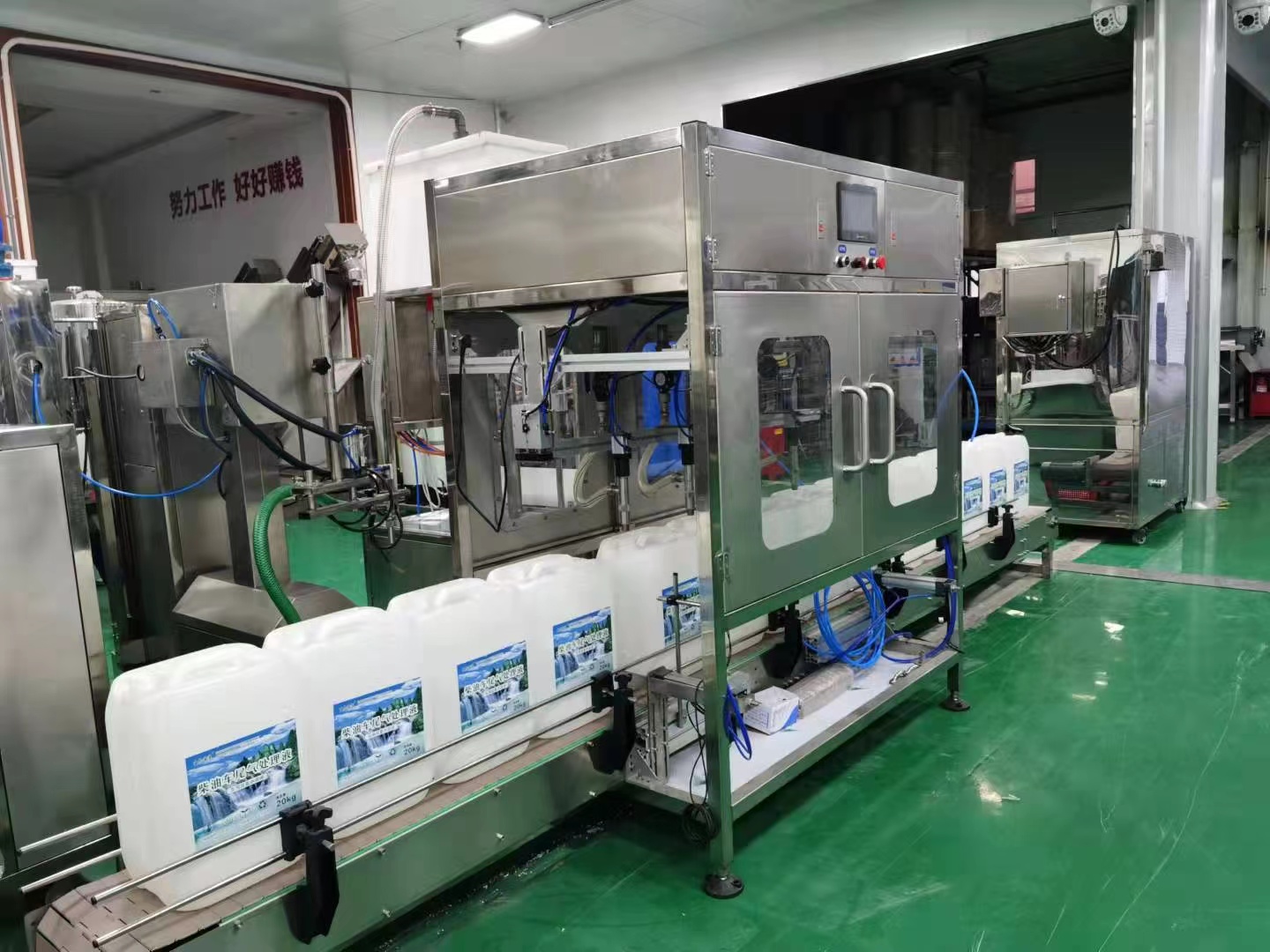 8、成品車用尿素溶液經(jīng)過每小時產(chǎn)量1500-2000公斤的高效氣動重力灌裝機(jī)罐裝,在經(jīng)過擰蓋機(jī)或人工擰蓋、鋁箔機(jī)封口,貼標(biāo)即為標(biāo)準(zhǔn)車用尿素容易成品。
