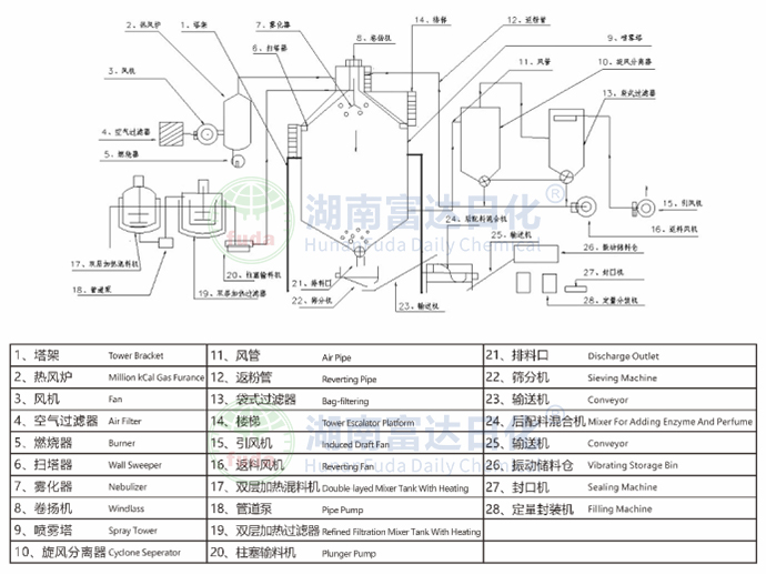 干燥塔(干燥塔體、塔承載加強圈、骨架、熱風(fēng)分布器、人孔檢修門、出風(fēng)管及清洗人孔、錐體氣錘、主塔支撐鋼架、進塔熱風(fēng)管道、變徑連接管道、保溫材料、伴熱攪拌罐、電加熱、過濾器)、熱源系統(tǒng)(燃?xì)鉄犸L(fēng)爐)、鼓風(fēng)機(鼓風(fēng)機、初/中效空氣過濾器)、進料泵、噴槍、高效旋風(fēng)分離器(高效旋風(fēng)分離器、旋風(fēng)出料閥、緩存料倉)、除塵系統(tǒng)(管道、布袋除塵器)、引風(fēng)機、控制系統(tǒng)(控制柜、變頻器、溫度傳感器、壓力傳感器)、輔助系統(tǒng)(欄桿、扶梯、現(xiàn)場電線電纜橋架、現(xiàn)場鋼架結(jié)構(gòu)平臺) |